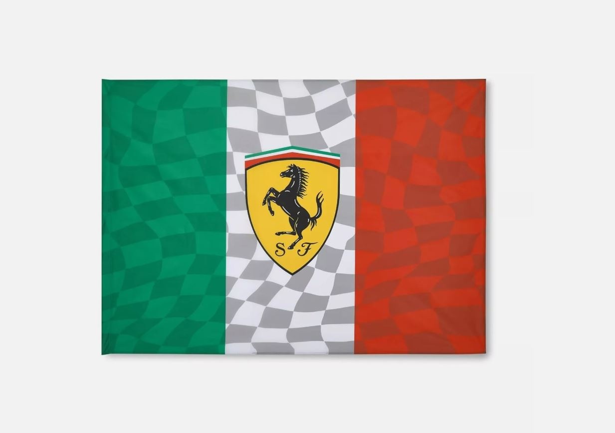 Official Scuderia Ferrari fan flag. 140cm x 100cm size. Scudetto shield Ferrari logo. Italian chequered flag detail.